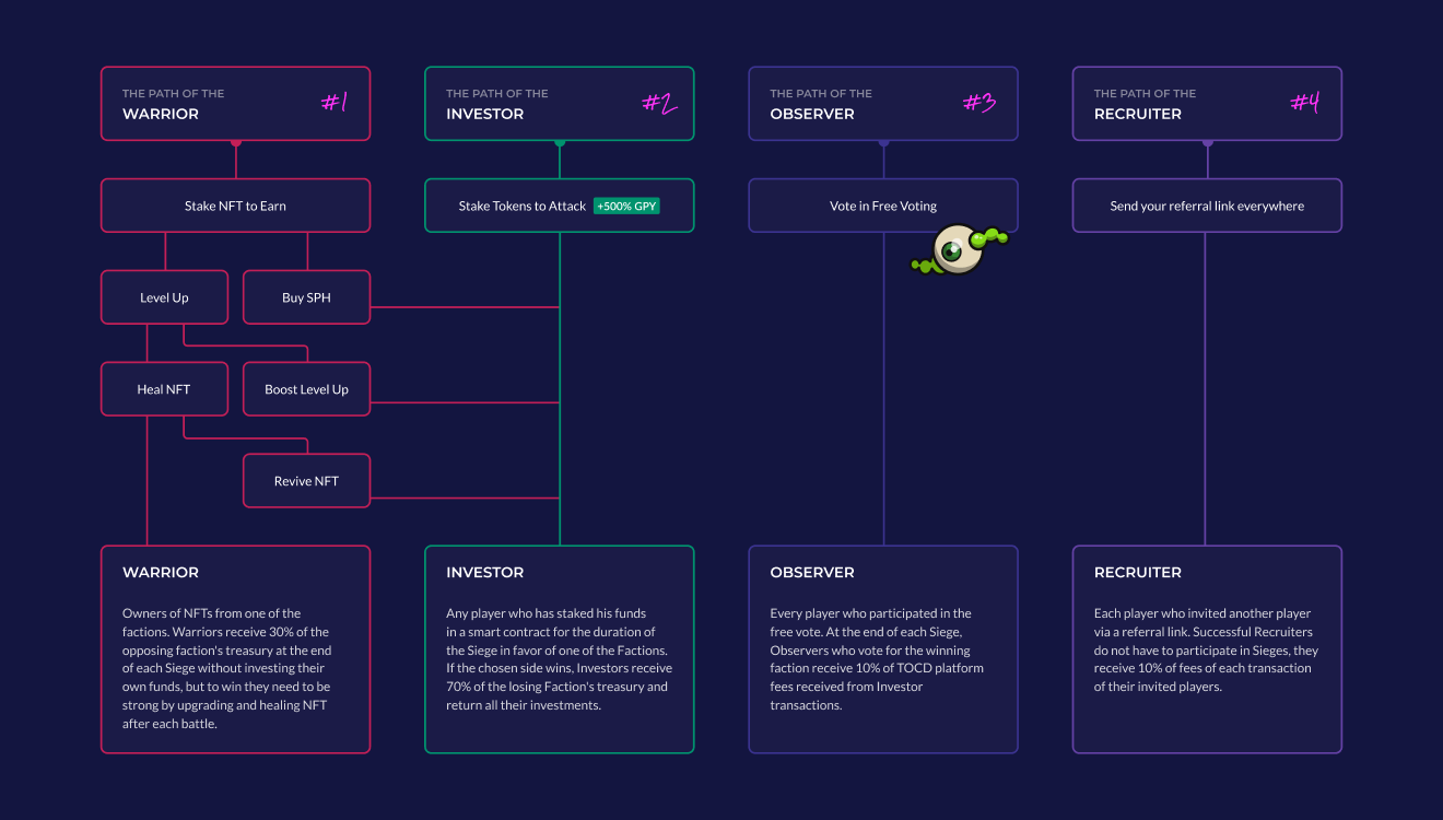 There are two main types of players - Warriors (NFT owners) and Investors (Treasury Tokens holders).