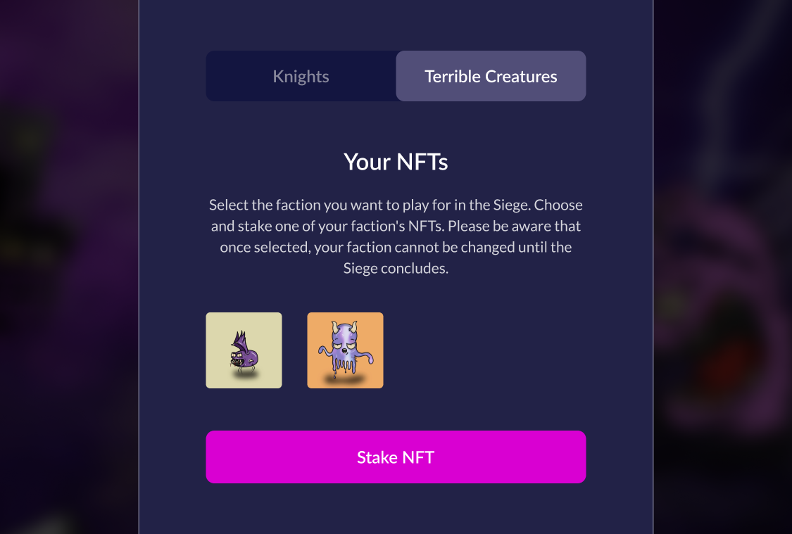 1. Click the "Stake to attack" button under the window of one of the Factions: